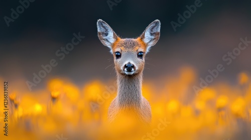 © BROPRADANA, Fototapeta premium Young deer in sunset meadow, wildlife scene