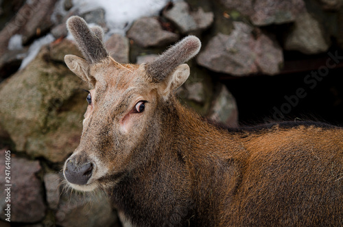 Fototapeta premium Young deer with fluffy horns worth amid a cliff