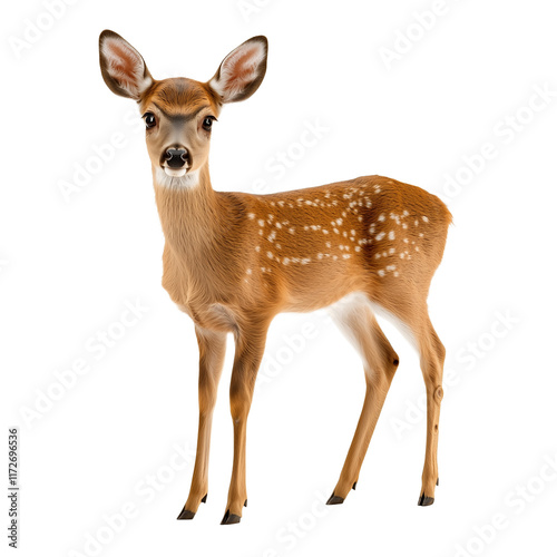 © DOUGLAS, Fototapeta premium young deer with white spots on its brown fur stands gracefully, isolated on transparency background, showcasing its delicate features and alert expression