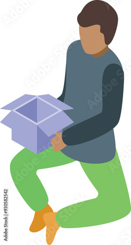 © ylivdesign, Fototapeta premium Young delivery man is kneeling and holding an open cardboard box