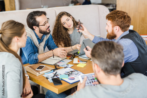 Fototapeta premium Young designer showing his colleagues something curious in smartphone