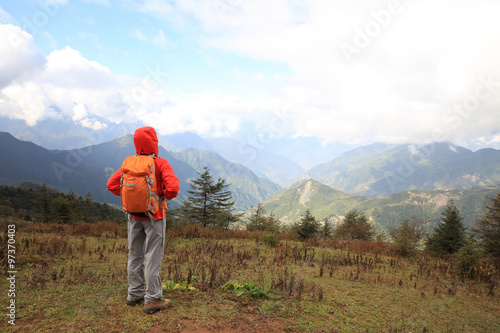 © lzf, Naklejka premium young determined woman backpacker hiking on mountain peak