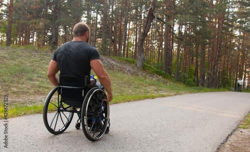 Obraz premium Young disabled athlete in a walking pine park in a wheelchair