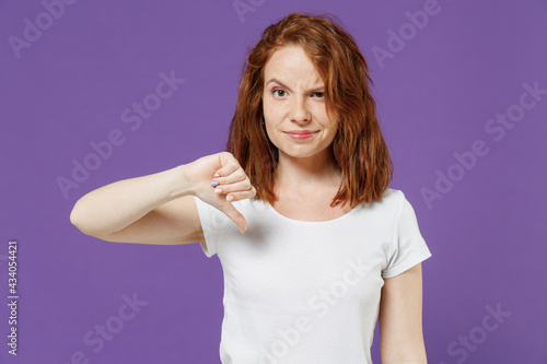 © ViDi Studio, Fototapeta premium Young dissatisfied displeased sad disappointed caucasian woman in white basic blank print design t-shirt showing thumb down dislike gesture isolated on dark violet color background studio portrait
