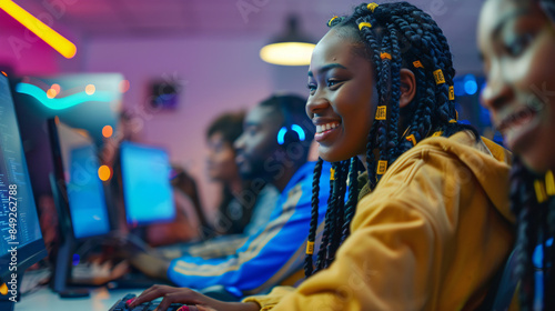 Obraz premium Young, diverse gamers smiling while competing in an esports tournament