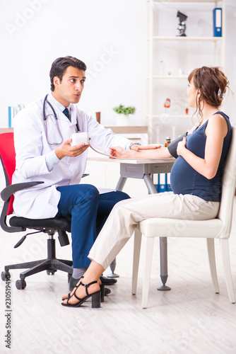 Fototapeta premium Young doctor checking pregnant woman's blood pressure