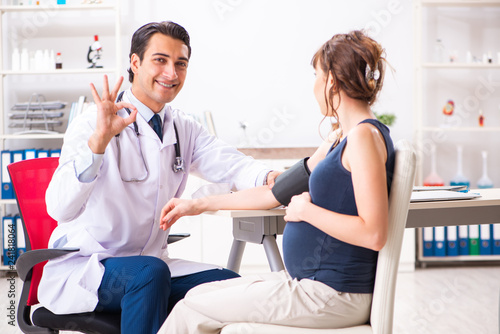 Fototapeta premium Young doctor checking pregnant woman's blood pressure