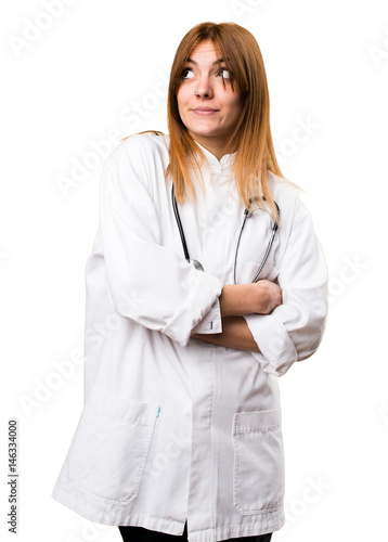 © luismolinero, Fototapeta premium Young doctor woman making unimportant gesture