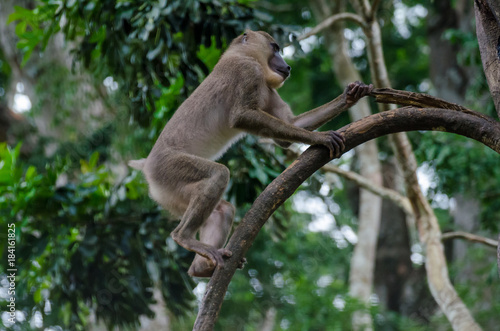 © Fabian, Naklejka premium Young drill monkey climbing tree in rain forest of Nigeria
