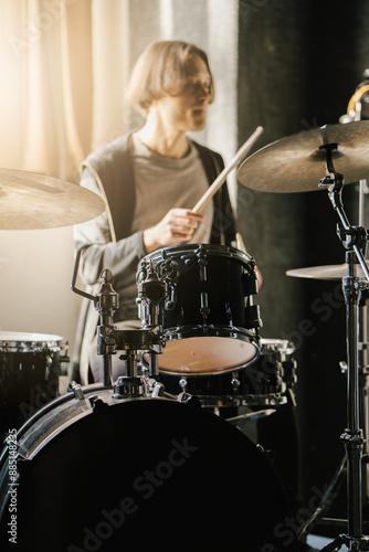 Fototapeta premium Young drummer playing drums in music studio, vibrant and energetic...