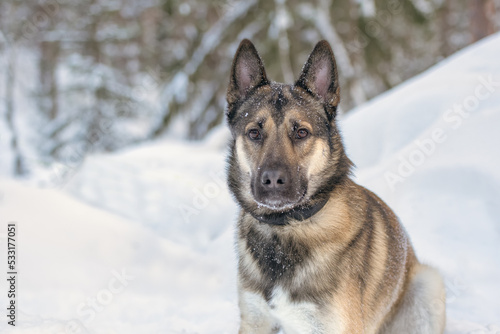 © Juha Saastamoinen, Naklejka premium Young east siberian laika walking in deep snow