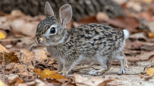 © Zaenal, Fototapeta premium Young Eastern Cottontail Rabbit Among Autumn Leaves