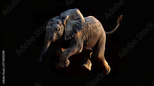 © adnan, Obraz premium Young elephant walking dynamically highlighted against a dramatic dark backdrop for advertising.