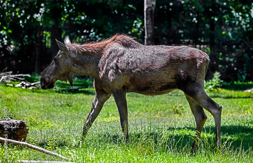 Fototapeta premium Young elk walking on the lawn. Latin name - Alces alces