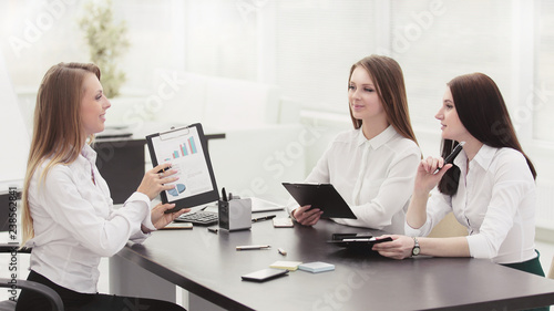 Fototapeta premium young employees are talking sitting behind a Desk.