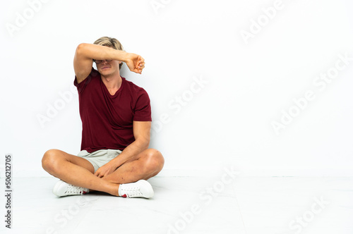 © luismolinero, Fototapeta premium Young English man sitting on the floor covering eyes by hands