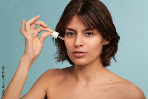 © kegfire, Obraz premium Young ethnic lady with perfect skin applying serum on face