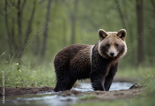 © Hafiza Khatun Shapla, Obraz premium Young eurasian brown bear standing in forest stream