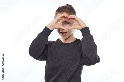 © Yulia, Naklejka premium Young European female with pretty look, blond hair, dressed sporty, shows love sign with hands cupped in heart shape, feels love to someone, stands isolated over white studio wall background.