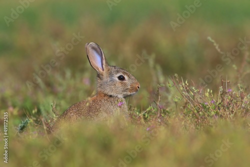© Monikasurzin, Fototapeta premium Young European rabbit in the nature habitat. Oryctolagus cuniculus. Wildlife scene from nature. Portrait of a European rabbit.