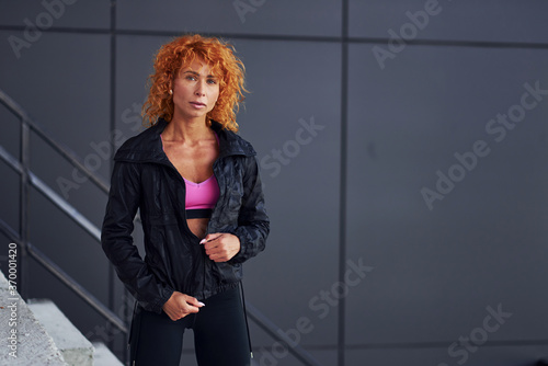 Fototapeta premium Young european redhead woman in sportive clothes standing outdoors