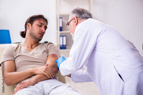 Fototapeta premium Young face injured man visiting experienced male doctor traumato