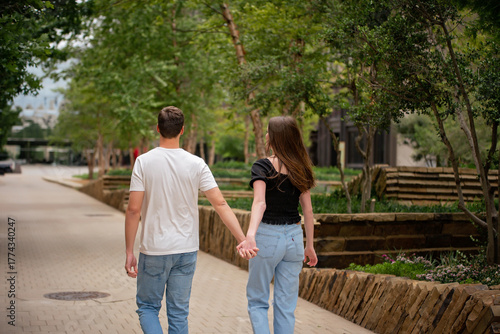 Fototapeta premium Young Faceless Couple Hold Hands Affectionately in City Park