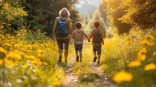 © Cristina, Fototapeta premium Young family hiking on mountain