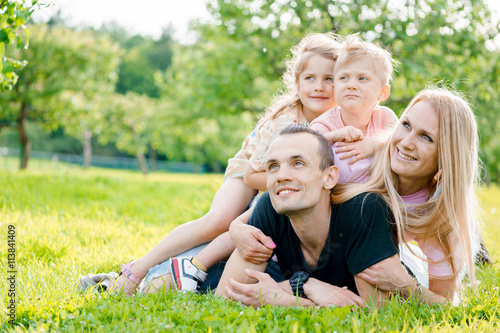 © snedorez, Naklejka premium Young family lying on grass in countryside