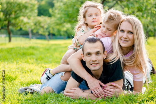 © snedorez, Fototapeta premium Young family lying on grass in countryside