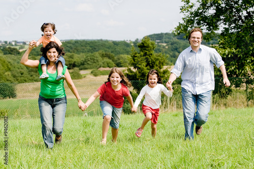 © PictureArt, Fototapeta premium Young family running over a farmer´s field