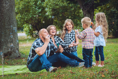 Fototapeta premium Young family with cheerful children in the park
