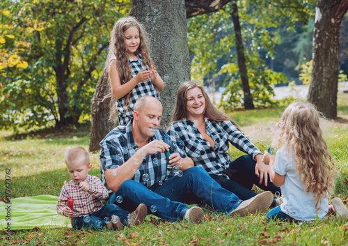© romaset, Fototapeta premium Young family with cheerful children in the park
