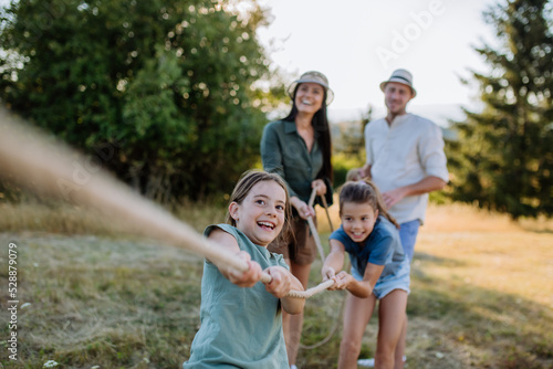 Fototapeta premium Young family with happy kids having fun together outdoors pulling rope in...