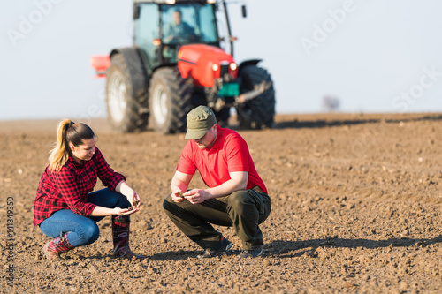 © Dusan Kostic, Naklejka premium Young farmers examing dirt while tractor is plowing fields