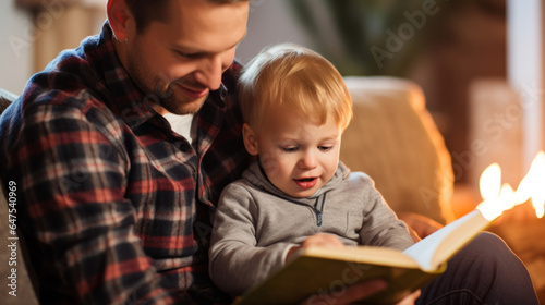 Obraz premium Young father reading a book to his son. Parent bonding and learning with toddler