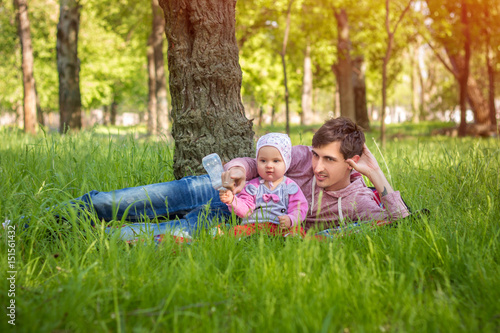 © serhiilysenko, Fototapeta premium Young father with baby outdoors in park
