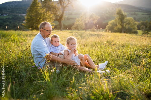 Fototapeta premium Young father with two small children sitting on meadow outdoors at sunset.