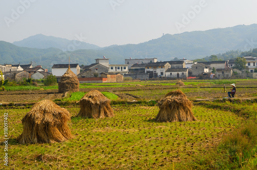 © Reimar, Obraz premium Young female art student painting haystacks and Hui style houses in farm field at Yanggancun village China