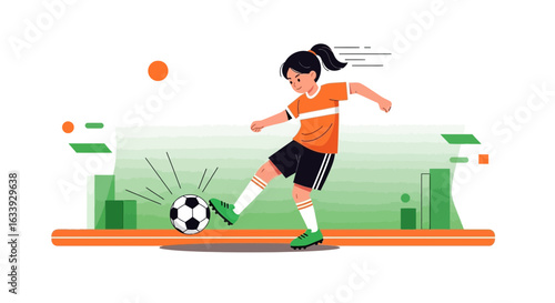 Fototapeta premium Young Female Athlete Kicking A Soccer Ball With Energy And Determination