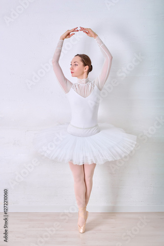© TRAVELARIUM, Naklejka premium Young female ballerina in elegant white tutu stands gracefully on pointe in bright minimalist studio. Soft lighting highlights serene expression and delicate posture against light-toned background