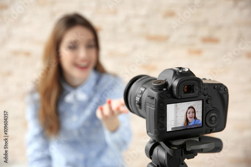 © Africa Studio, Naklejka premium Young female blogger with laptop on camera screen