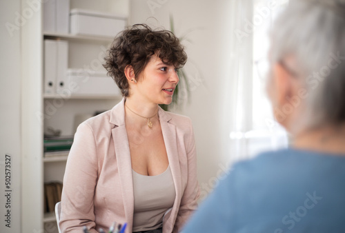 © Halfpoint, Fototapeta premium Young female candidate laughing at job interview.