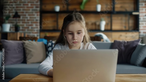 © Victoria, Naklejka premium Young female child sitting in front of laptop, engaged in digital activity.