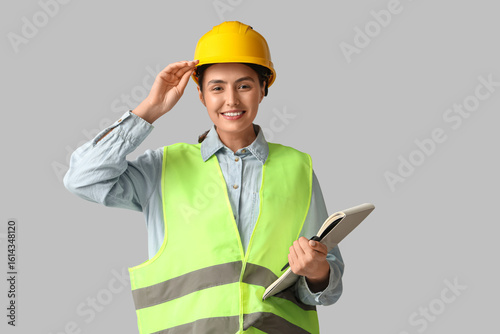 Fototapeta premium Young female construction worker with notebook and pen on grey background....