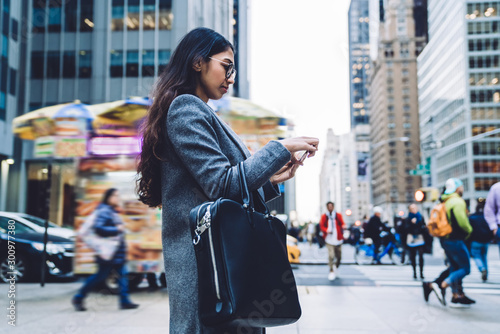 © BullRun, Fototapeta premium Young female crossing street and using smartphone