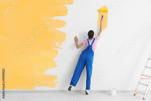 © Africa Studio, Fototapeta premium Young female decorator painting wall in room