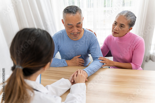 Fototapeta premium Young female doctor holding old man's hand to encourage