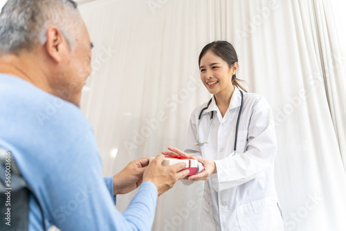 © pixs4u, Fototapeta premium Young female doctor receives a gift box from senior man