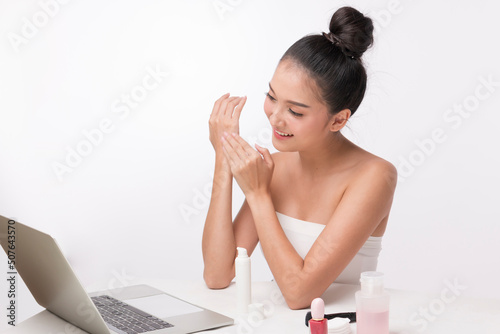 Obraz premium Young female doing make up online. Beautiful young woman close up face with clean skin isolated on white. Young Beautiful Asian Woman with Clean Fresh Skin on white background.